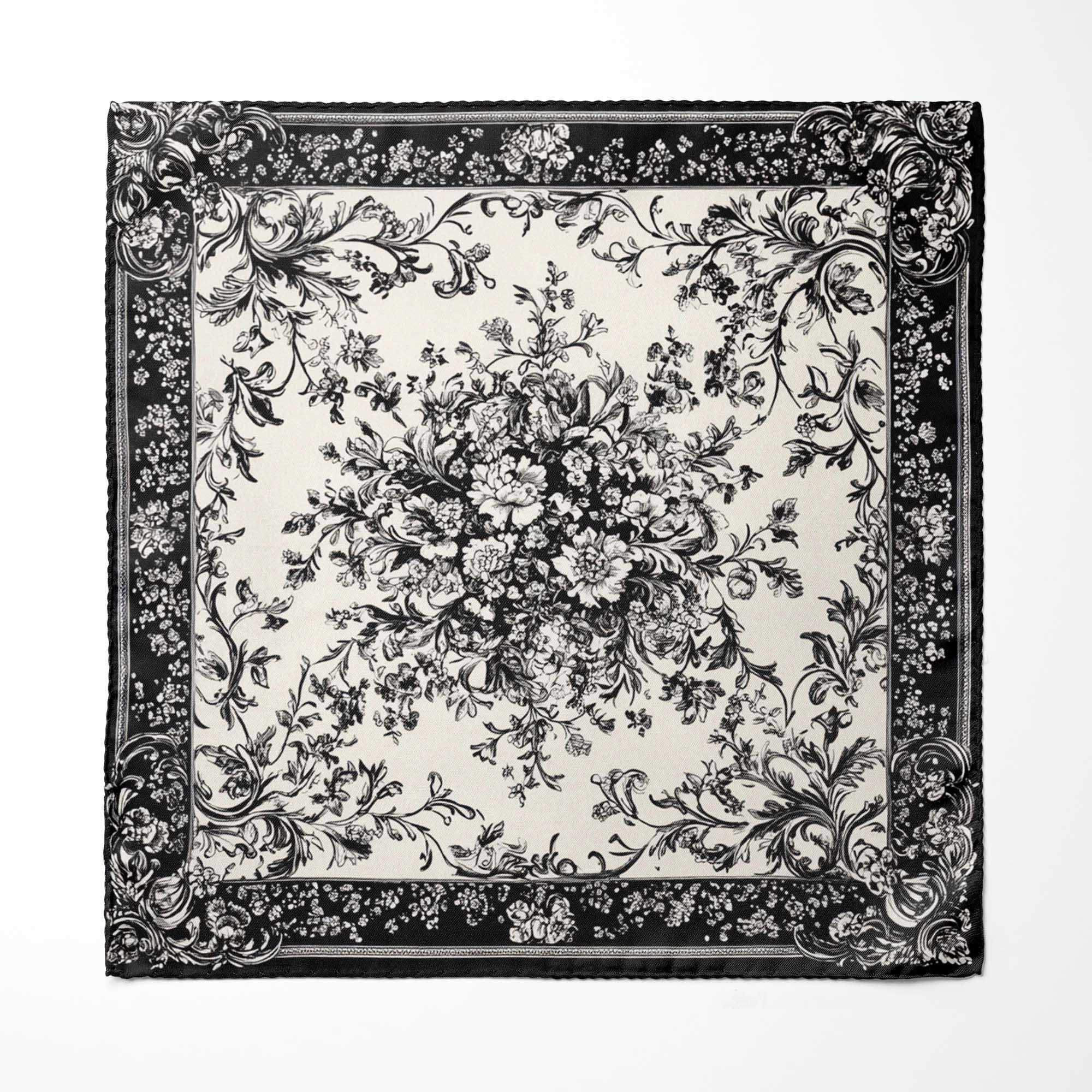 Sophisticated cream pocket square, featuring an intricate black and white floral pattern, exudes timeless elegance and style, perfect as a coat pocket handkerchief.
