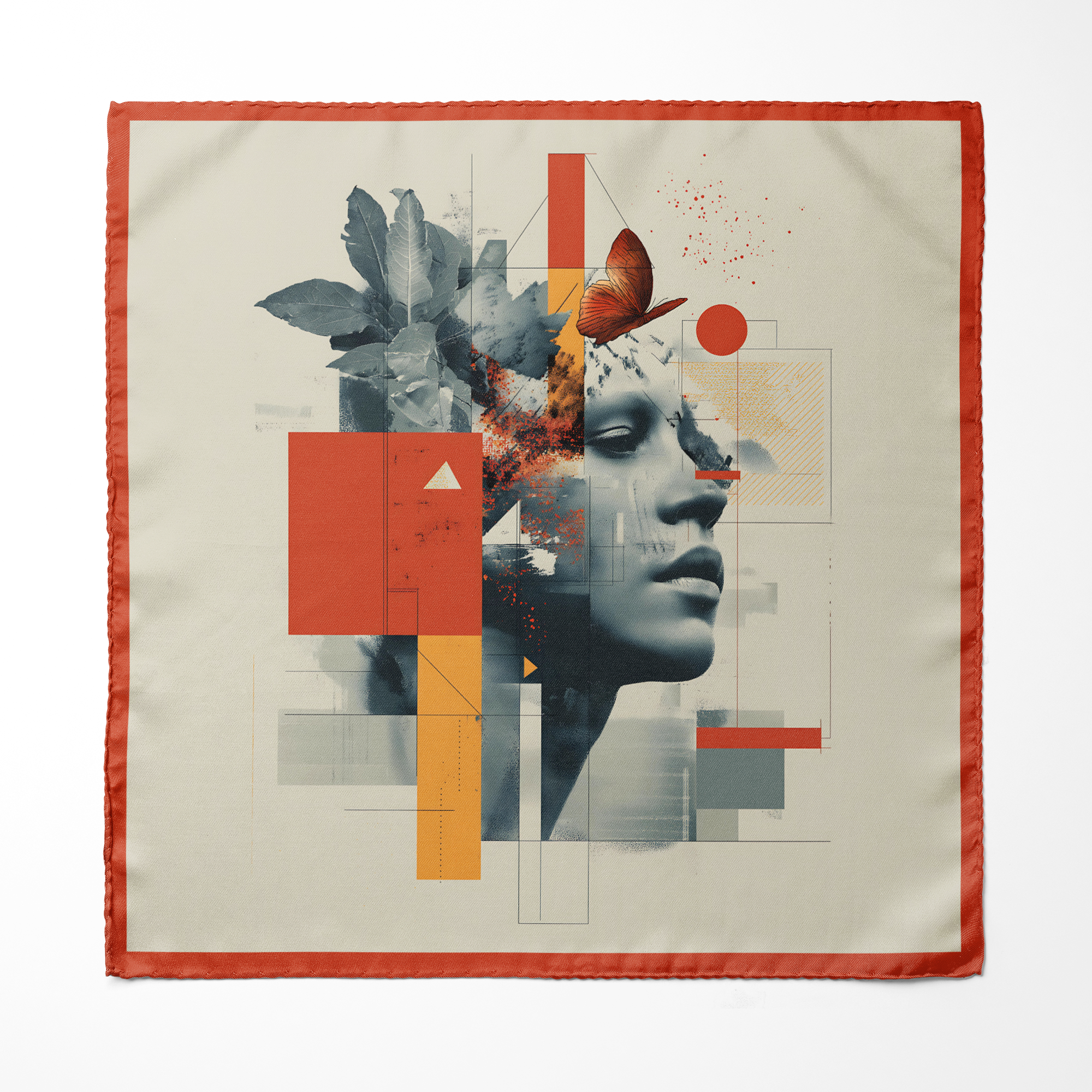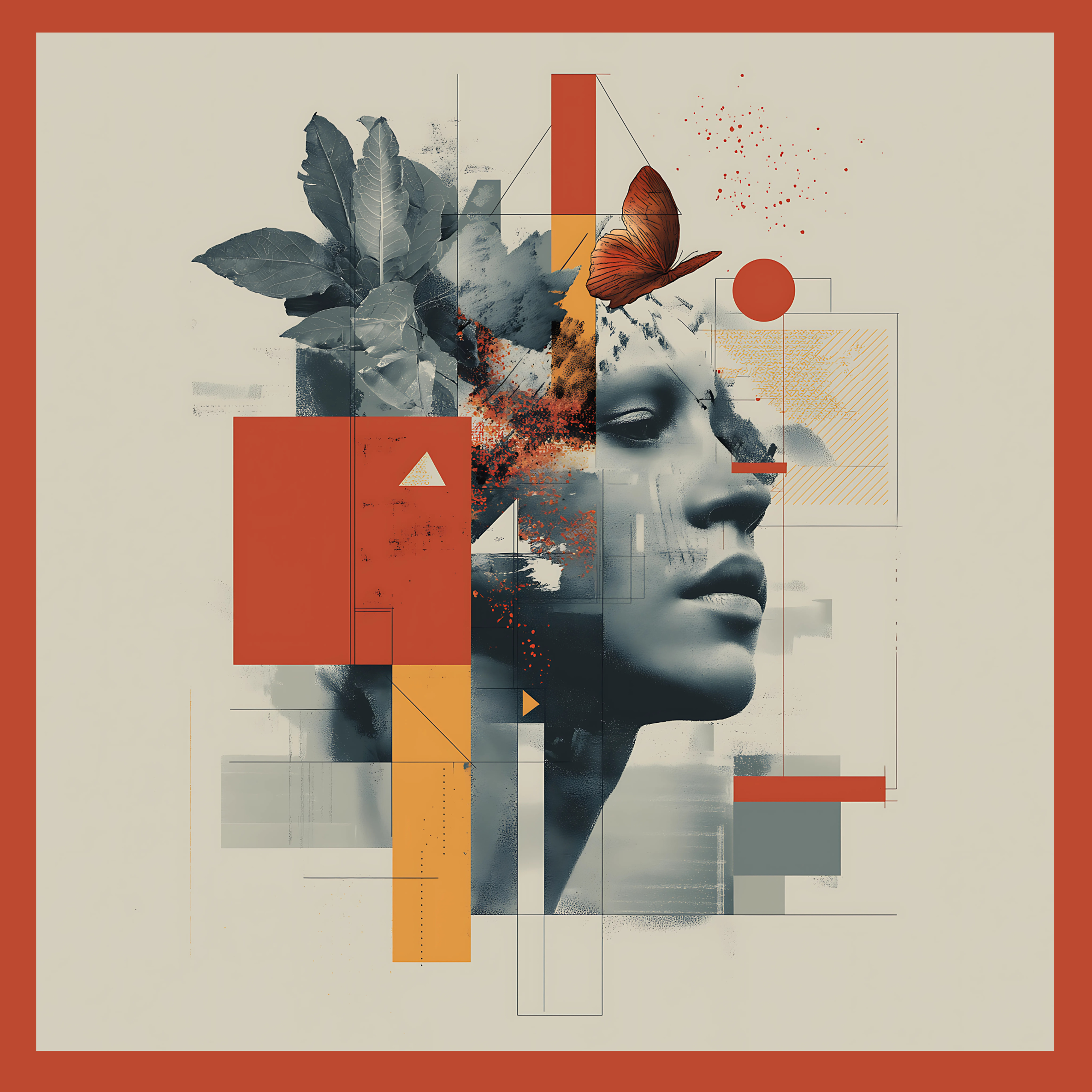A striking blend of geometric shapes and organic elements frames a serene human face in contemplative expression....