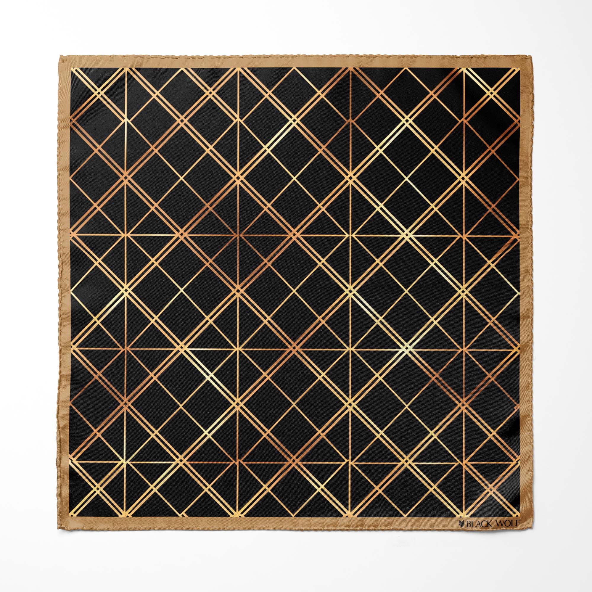 Pocket square is inspired by classic patterns, exudes sophistication and versatility. Its geometric design features intersecting diagonal lines in gold and bronze on a black background, framed by a solid bronze border.