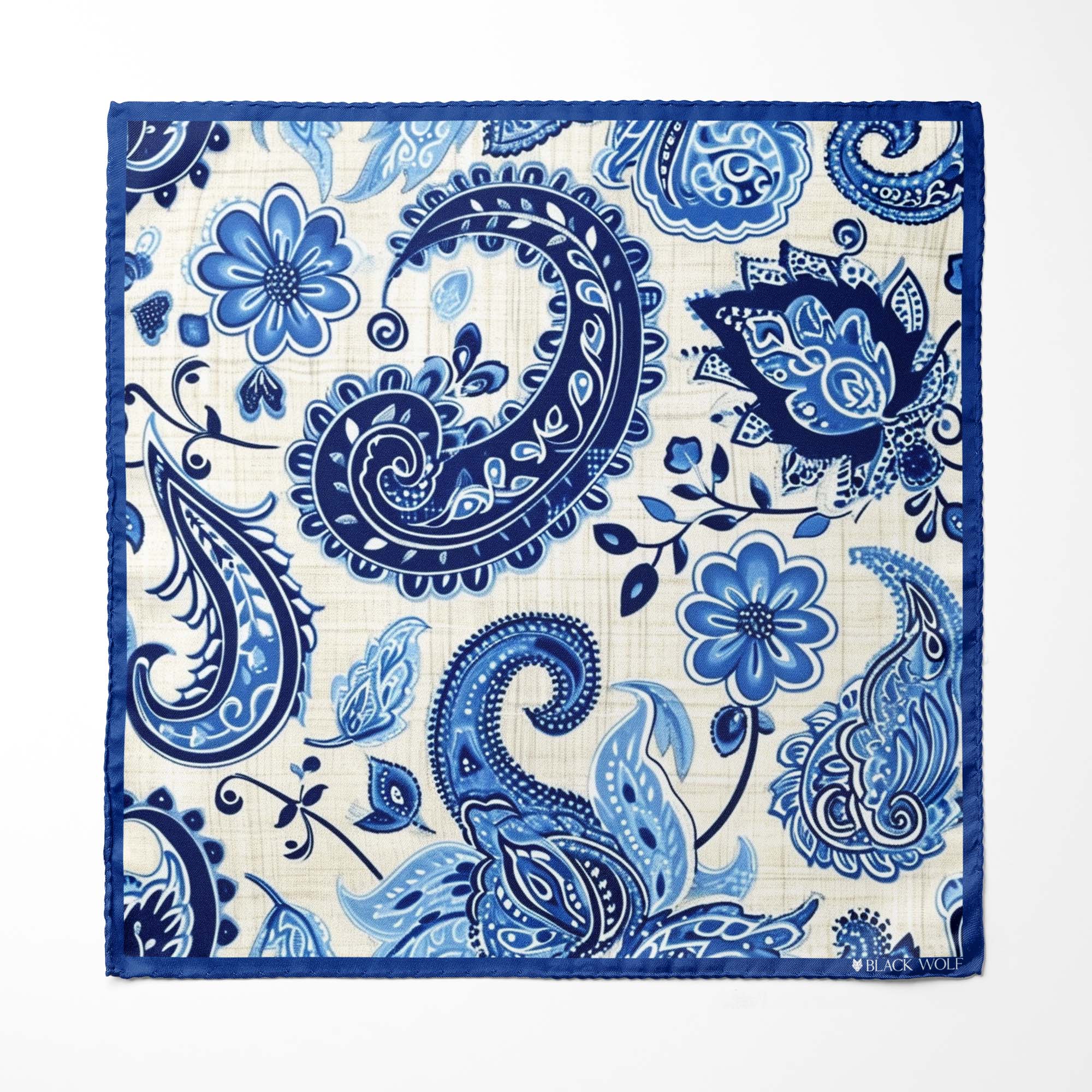 Sophisticated pocket square features paisley and floral designs in various shades of blue on a white backdrop, epitomizing grace and charm.