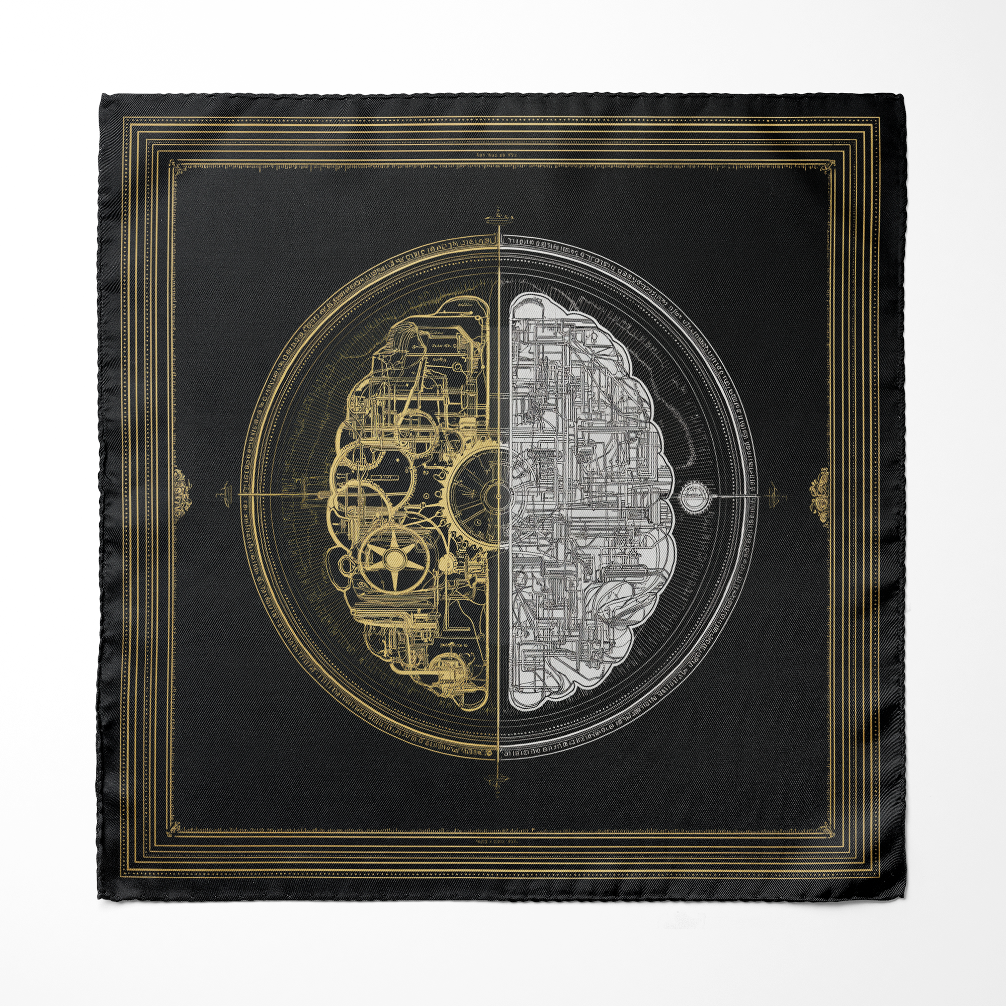 A mind divided between gears and circuits,balancing human thought with engineered logic. • Item: Pocket Square •...