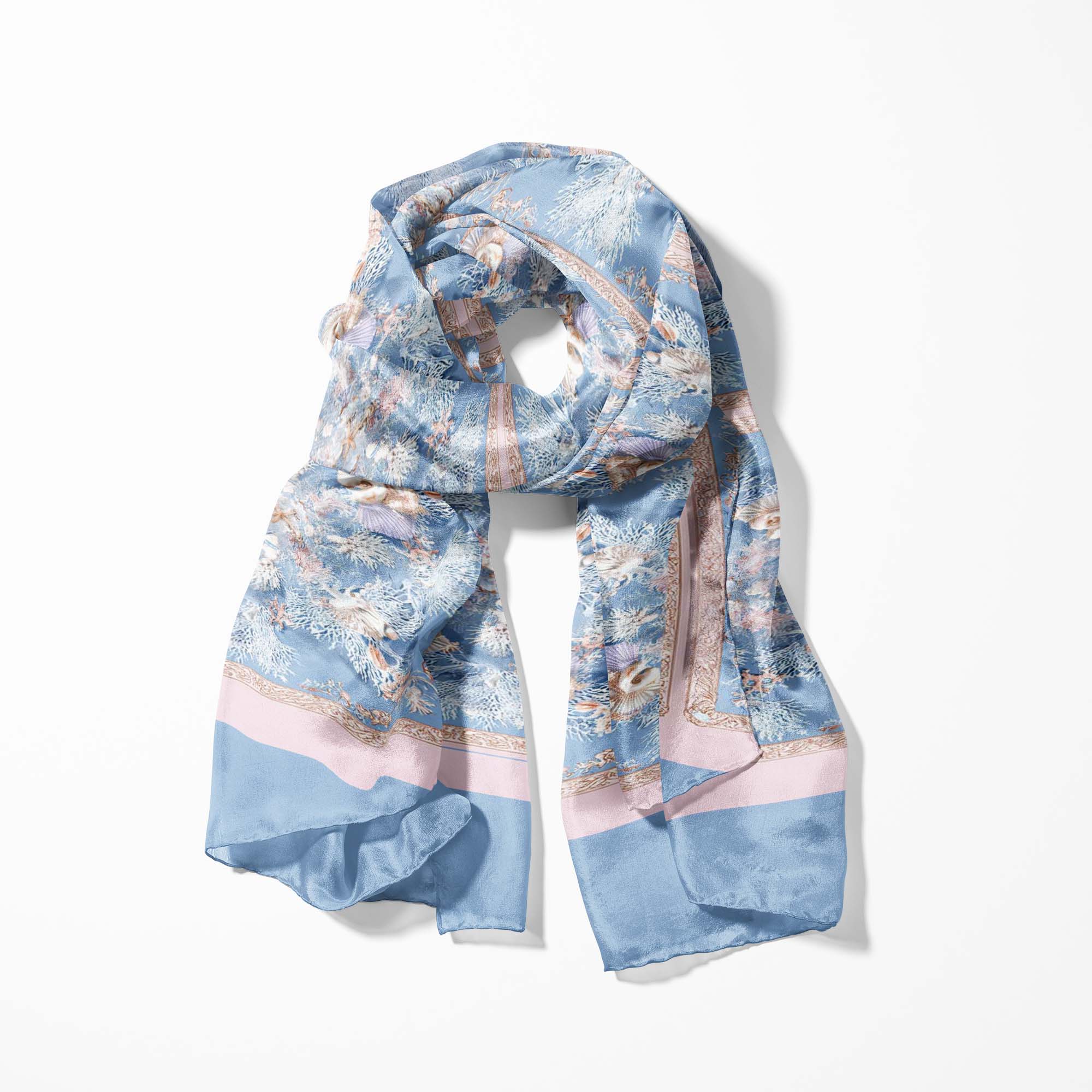 Sophisticated pocket square in soft powder blue, ivory, and blush pink, featuring delicate coral branches, seashells, and marine florals—capturing the serenity and elegance of underwater treasures.