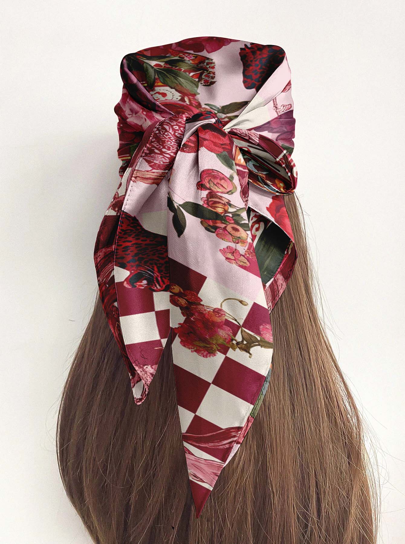 A bold fusion of fierce leopards, blooming florals, and a checkered backdrop in striking red and pink tones.