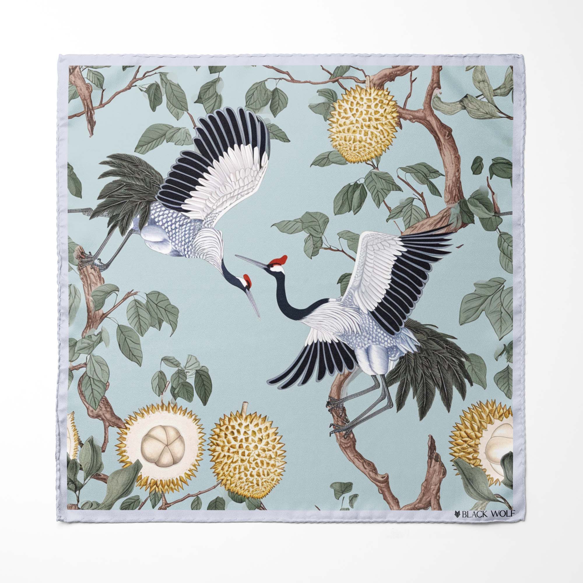 Sophisticated pocket square featuring two cranes in mid-flight, adorned with white and black feathers, red crowns, and long legs, set against a light blue background.