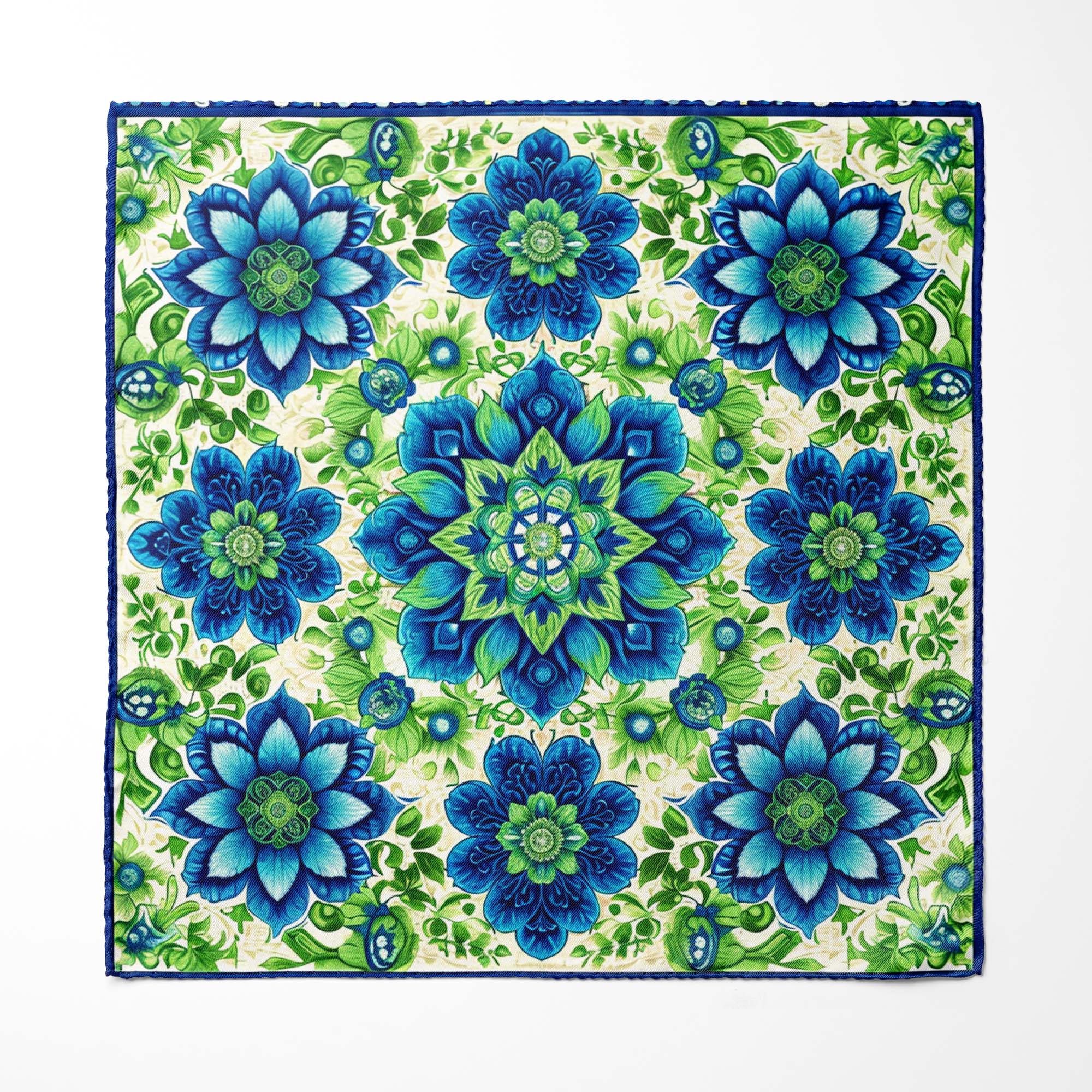 Elegant pocket square featuring floral design in vibrant blue and green hues on a white background, radiates elegance and timeless allure.