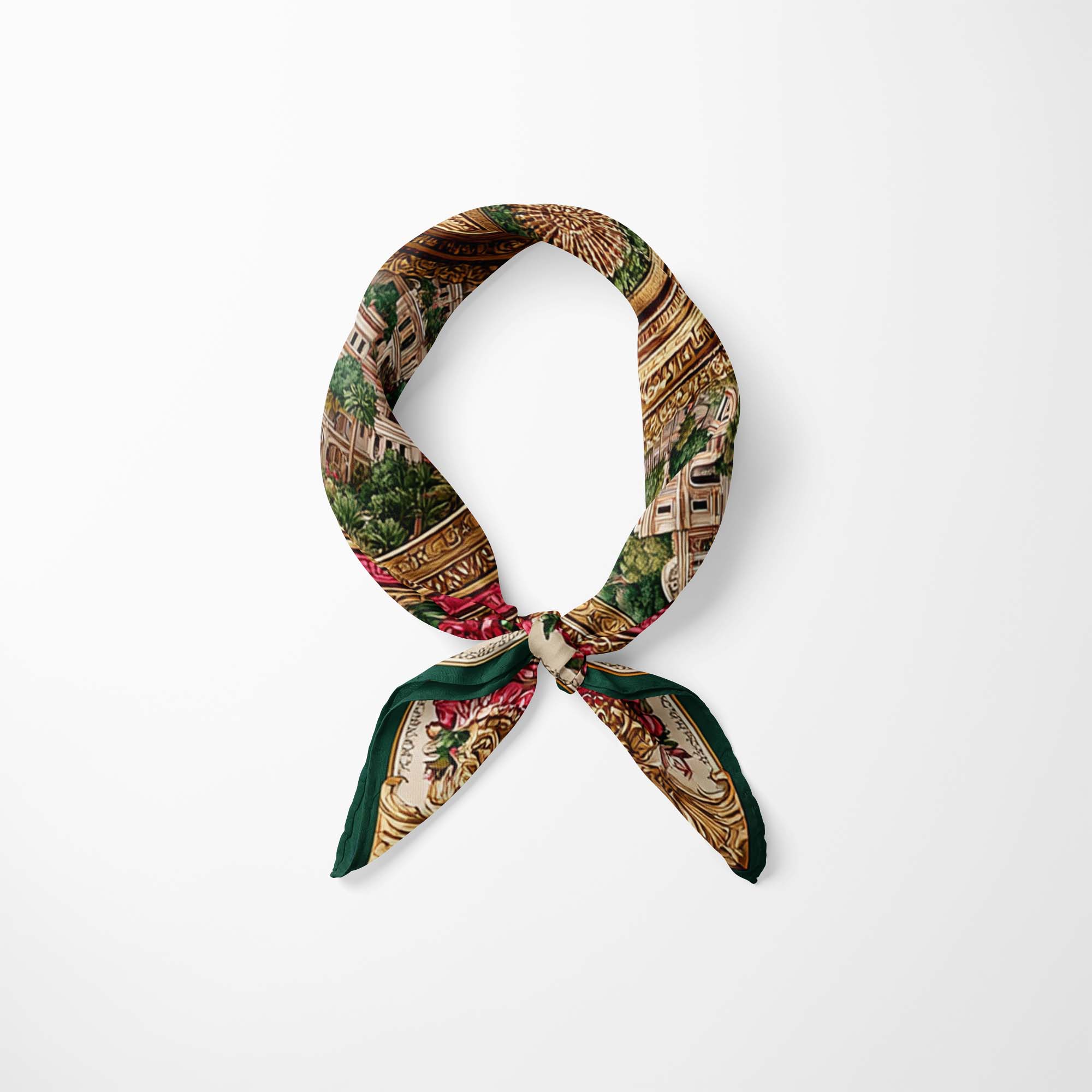 A regal architectural scene framed in intricate gold and pink ornamental borders, depicting a lush, classical cityscape with domes, palaces, and flowing waterways.