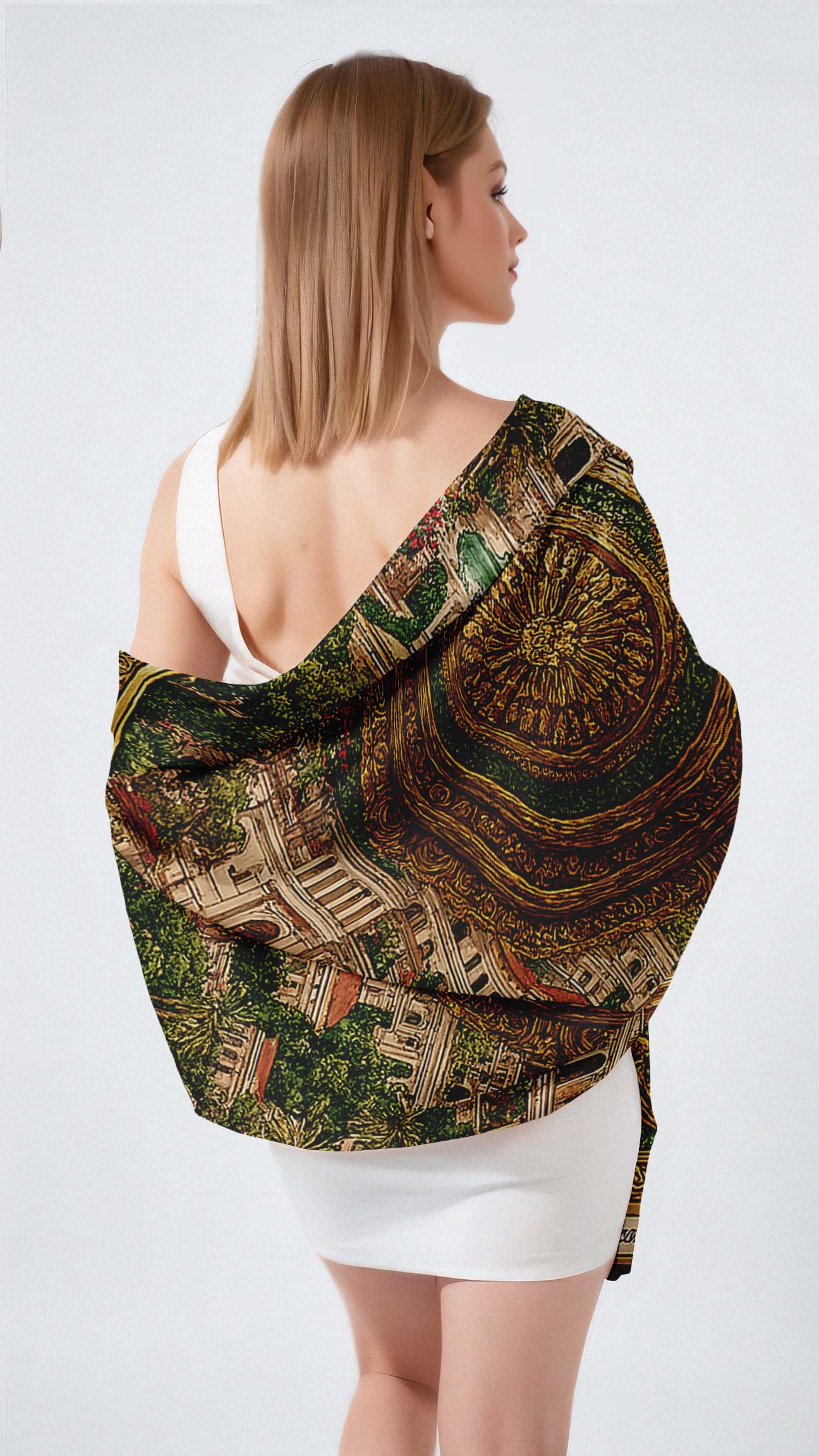 A regal architectural scene framed in intricate gold and pink ornamental borders, depicting a lush, classical cityscape with domes, palaces, and flowing waterways.