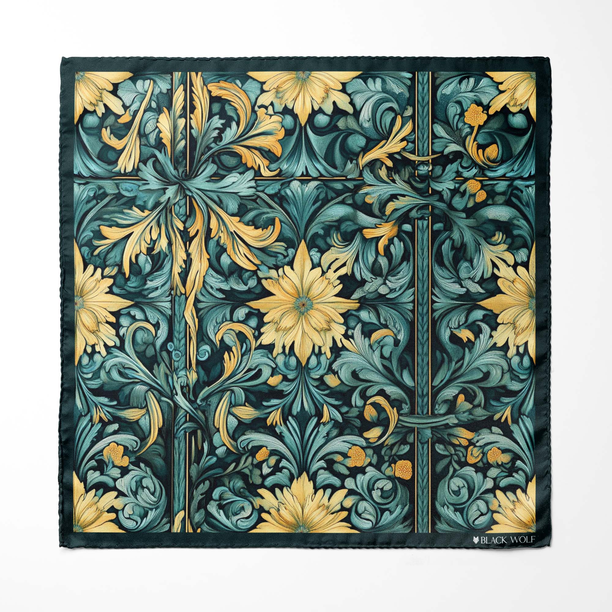 Ornate dark green pocket square, featuring intricate interwoven leaves and flowers in vibrant greens and yellows, exudes elegance and versatility, ideal as a sophisticated accessory for men's suits.