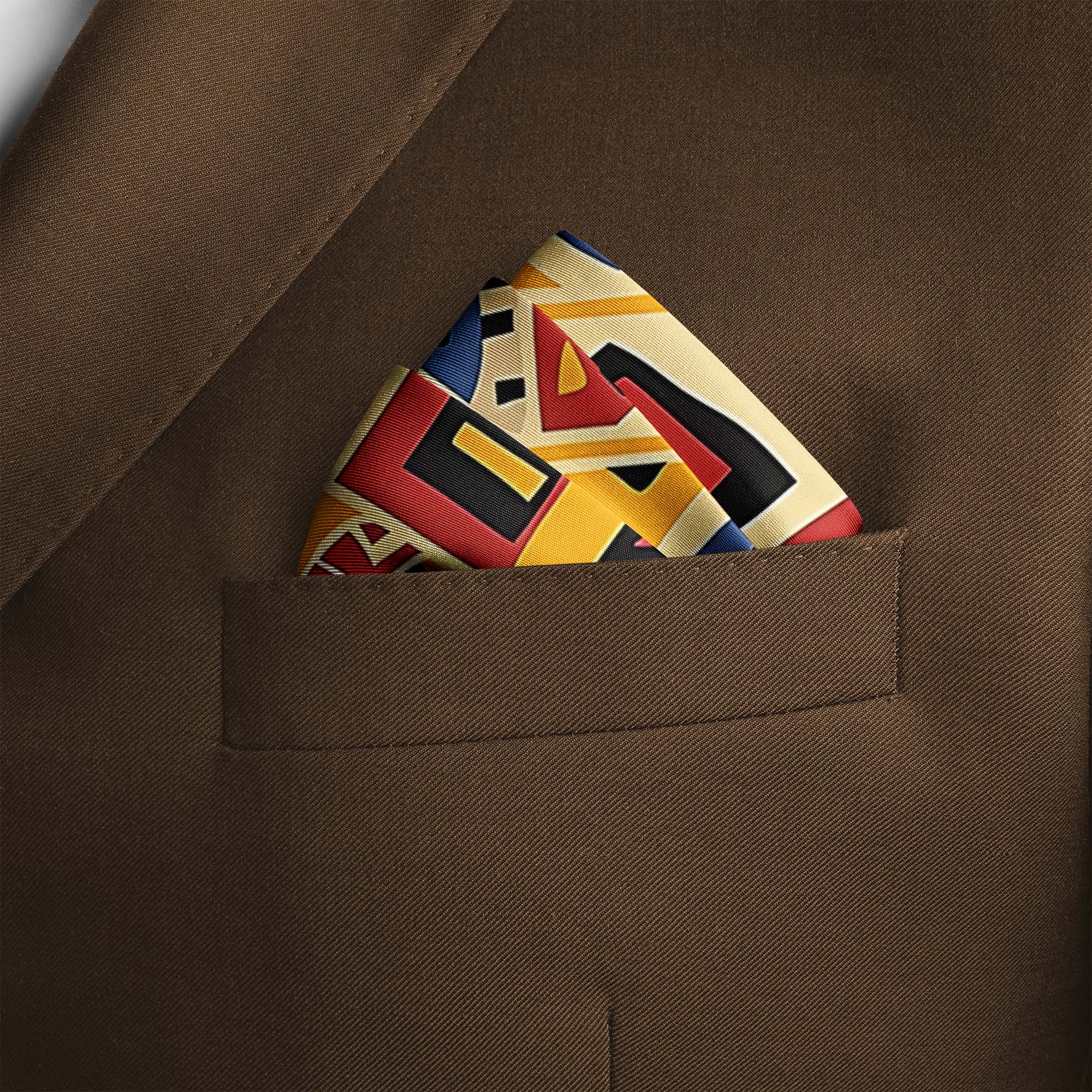 Sophisticated pocket square featuring a vibrant, geometric pattern in bold colors red, yellow, blue, black, and beige. With its symmetrical layout of triangles, diamonds, and rectangles, it embodies both refinement and versatility.