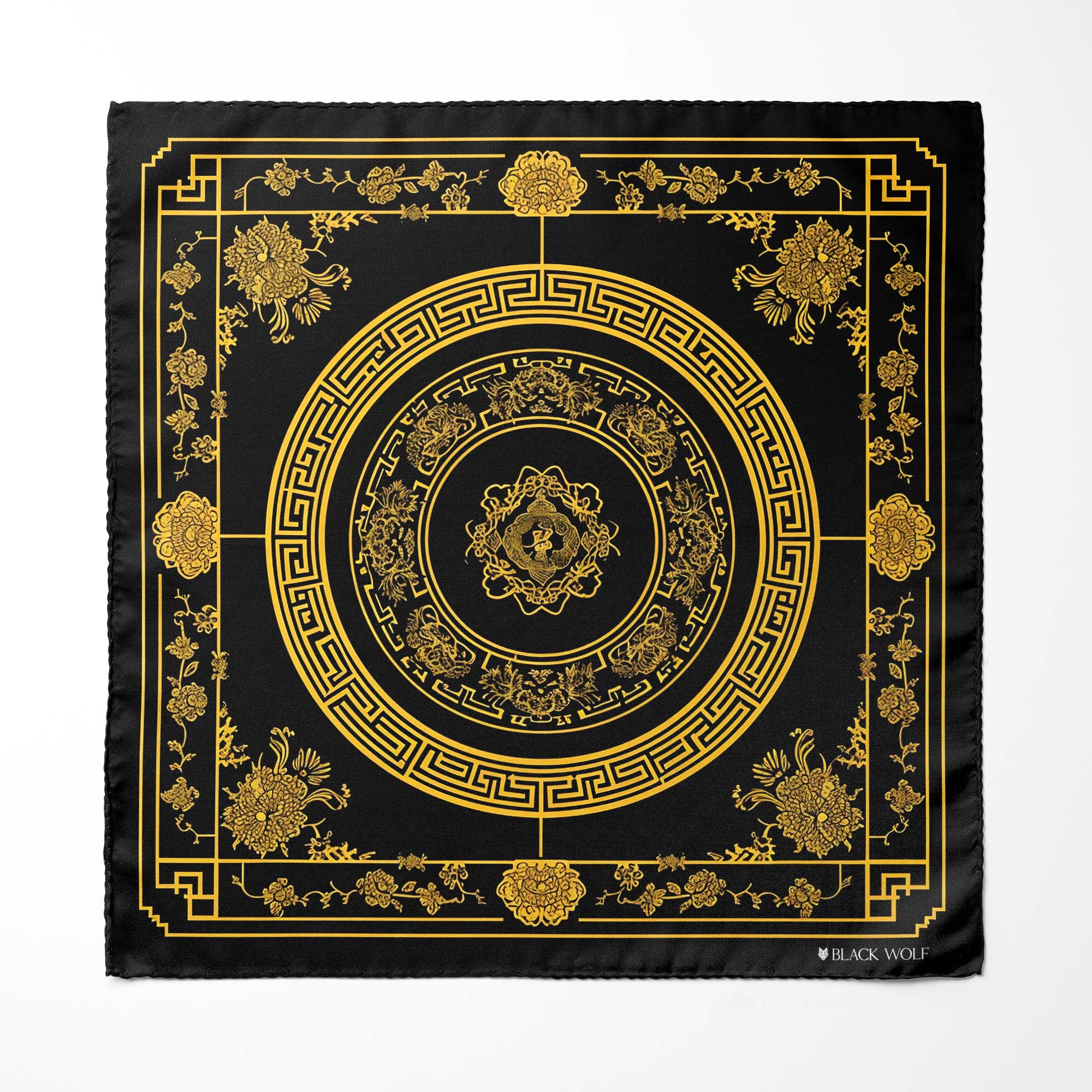 Elegant pocket square with black background and gold patterns, features a central circular motif surrounded by concentric circles with Greek key designs. The outer border, adorned with floral and geometric elements, exudes a refined and versatile charm.