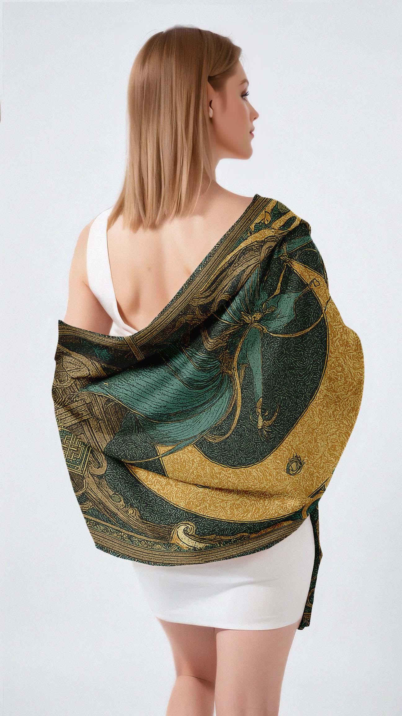 A celestial fairy dances before a golden crescent moon, surrounded by ornate architecture and swirling mystic elements. The intricate beige-toned detailing and teal accents create an enchanting, dreamlike ambiance.