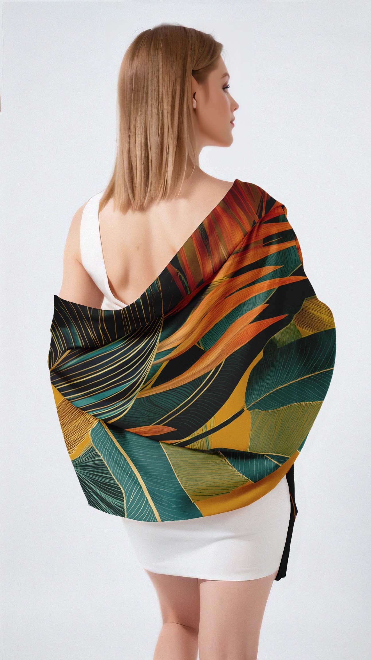 This design showcases vibrant tropical foliage with a striking combination of teal, orange, and golden tones. The mustard background enhances the bold, exotic feel of the lush overlapping leaves.