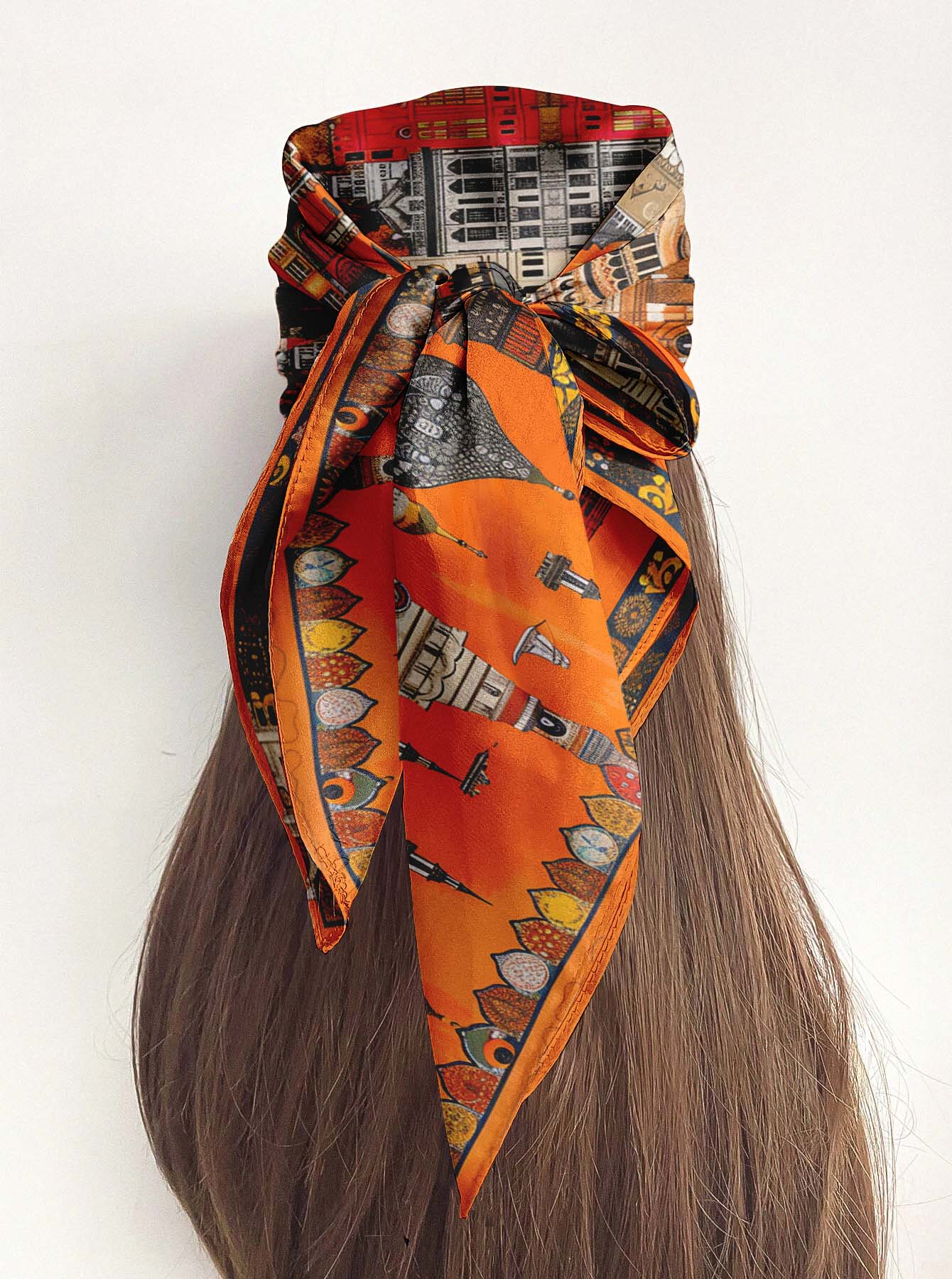 An intricate tapestry of iconic global landmarks brought together in a vivid cityscape bursting with cultural diversity. The bold orange backdrop adds vibrancy, highlighting the ornate details of each architectural marvel.