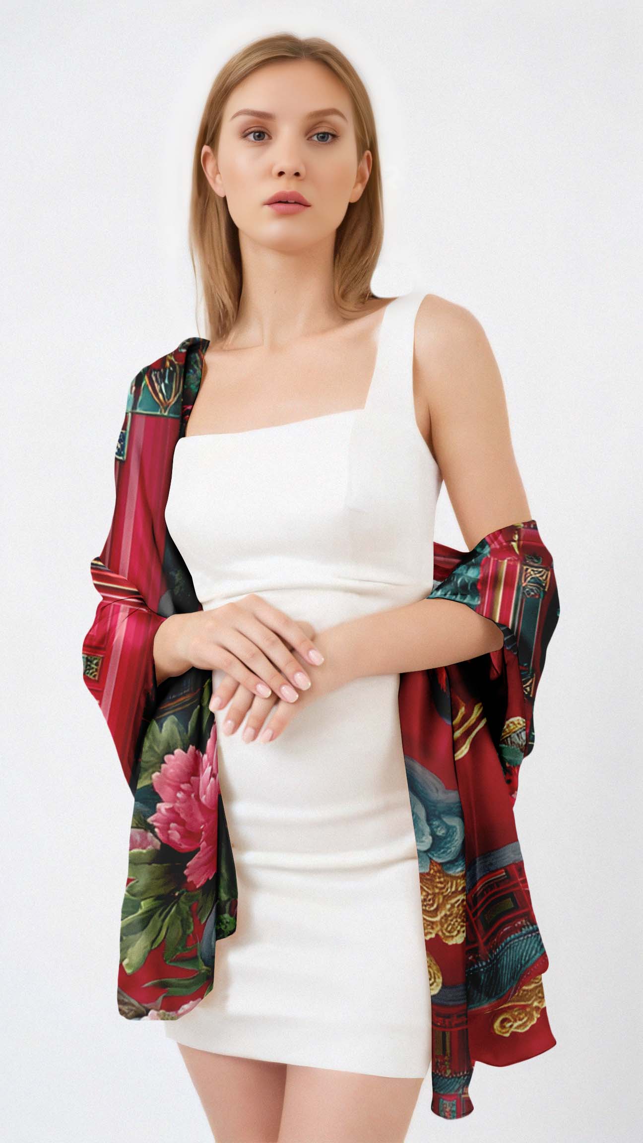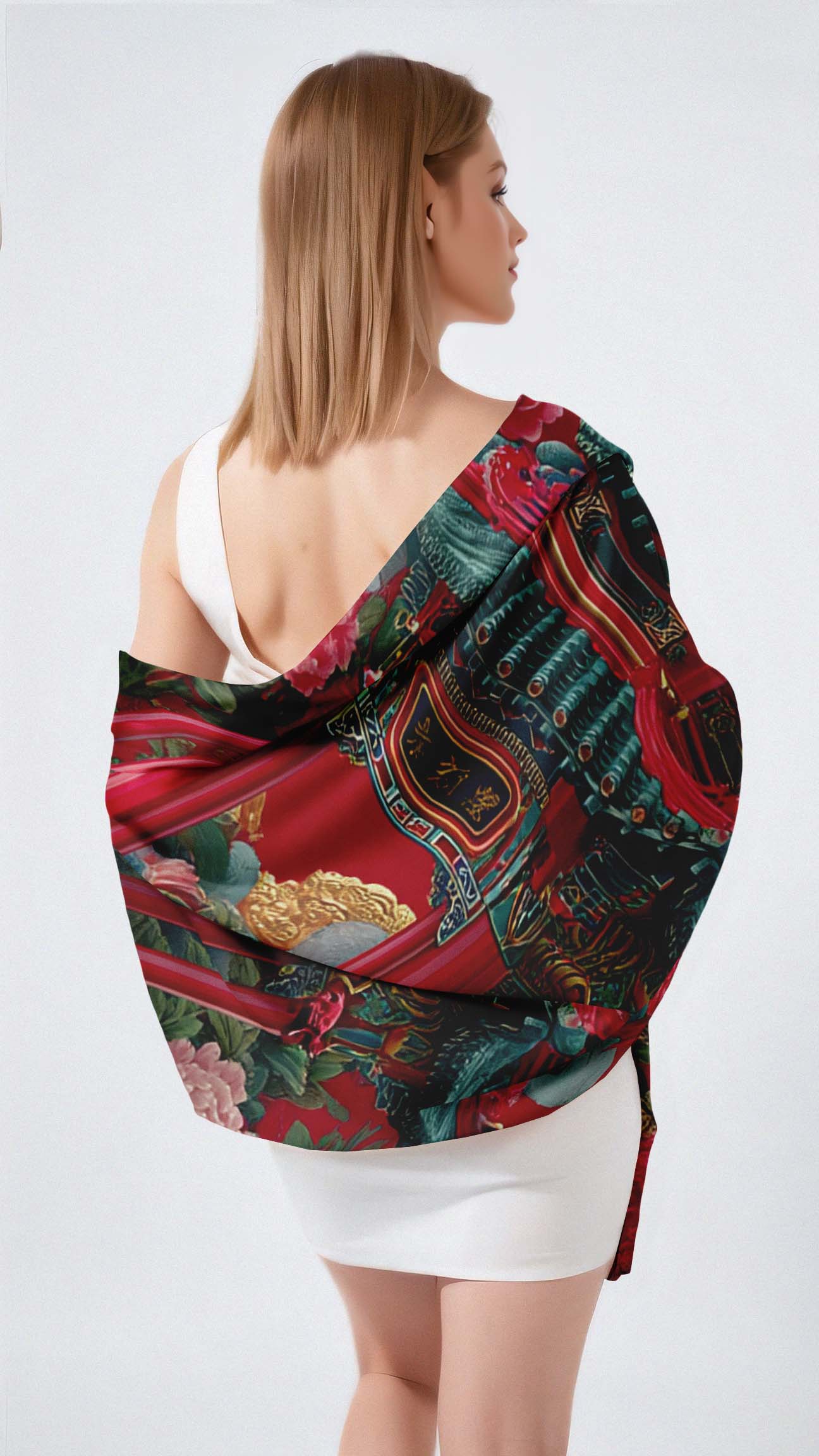 A majestic oriental scene featuring a traditional Chinese pagoda, surrounded by blooming peonies, phoenixes, and golden clouds, all painted in rich detail.