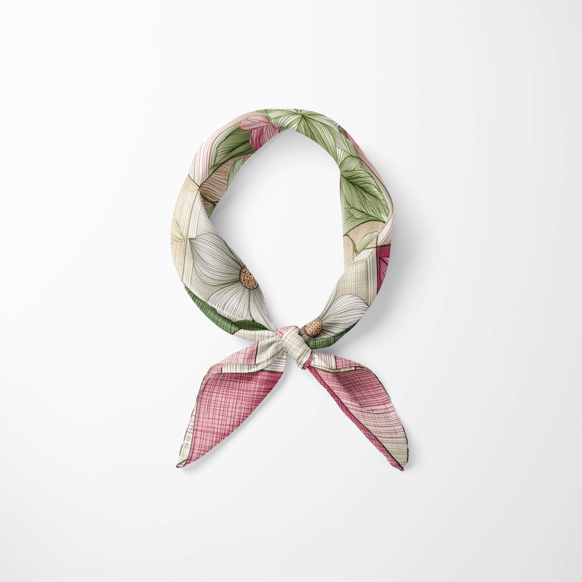 A delicate patchwork of blooming flowers and leafy greens arranged in symmetrical tiles. Soft pastel hues over a beige woven texture give it a handcrafted, vintage charm.