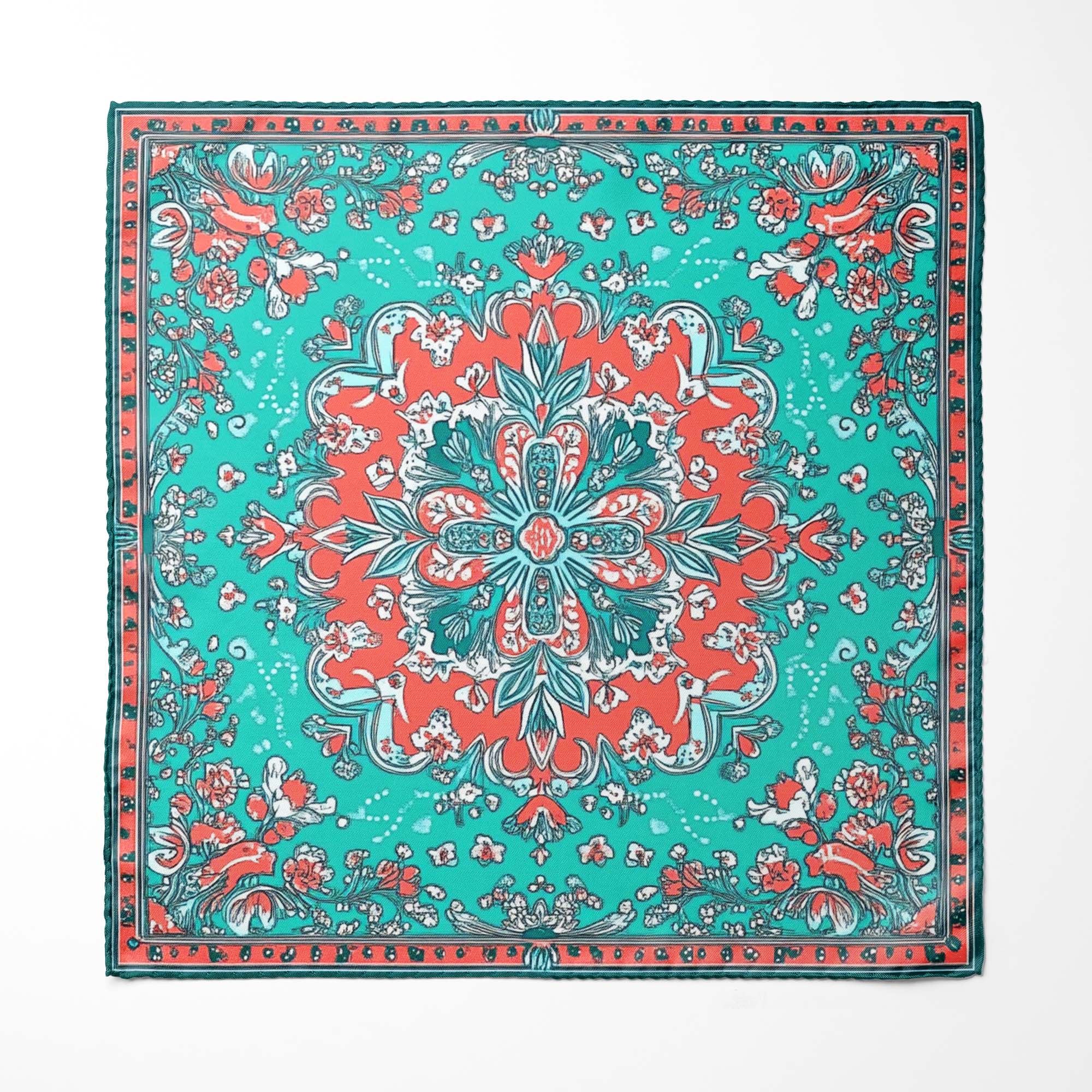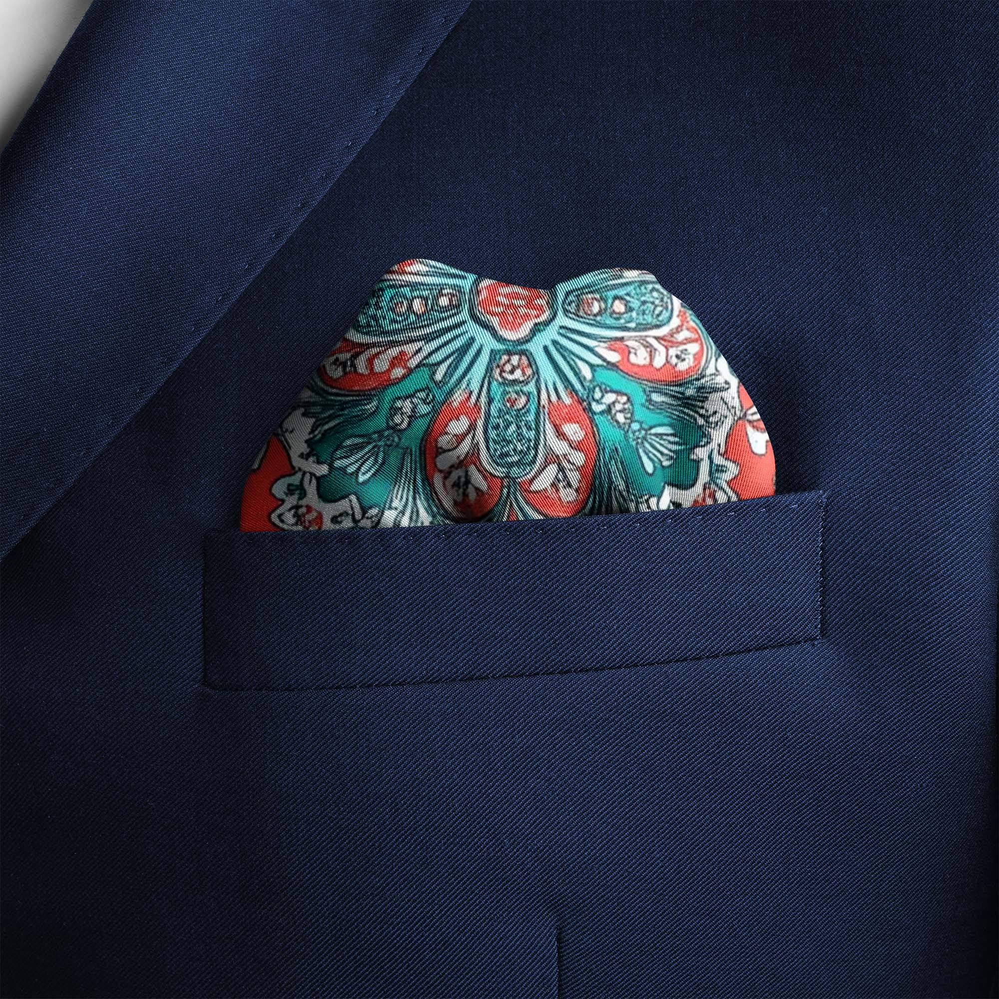 Elegant pocket square featuring a richly detailed floral and paisley pattern in vibrant teal, embodies sophistication and versatility, making it a striking accessory for any suit.