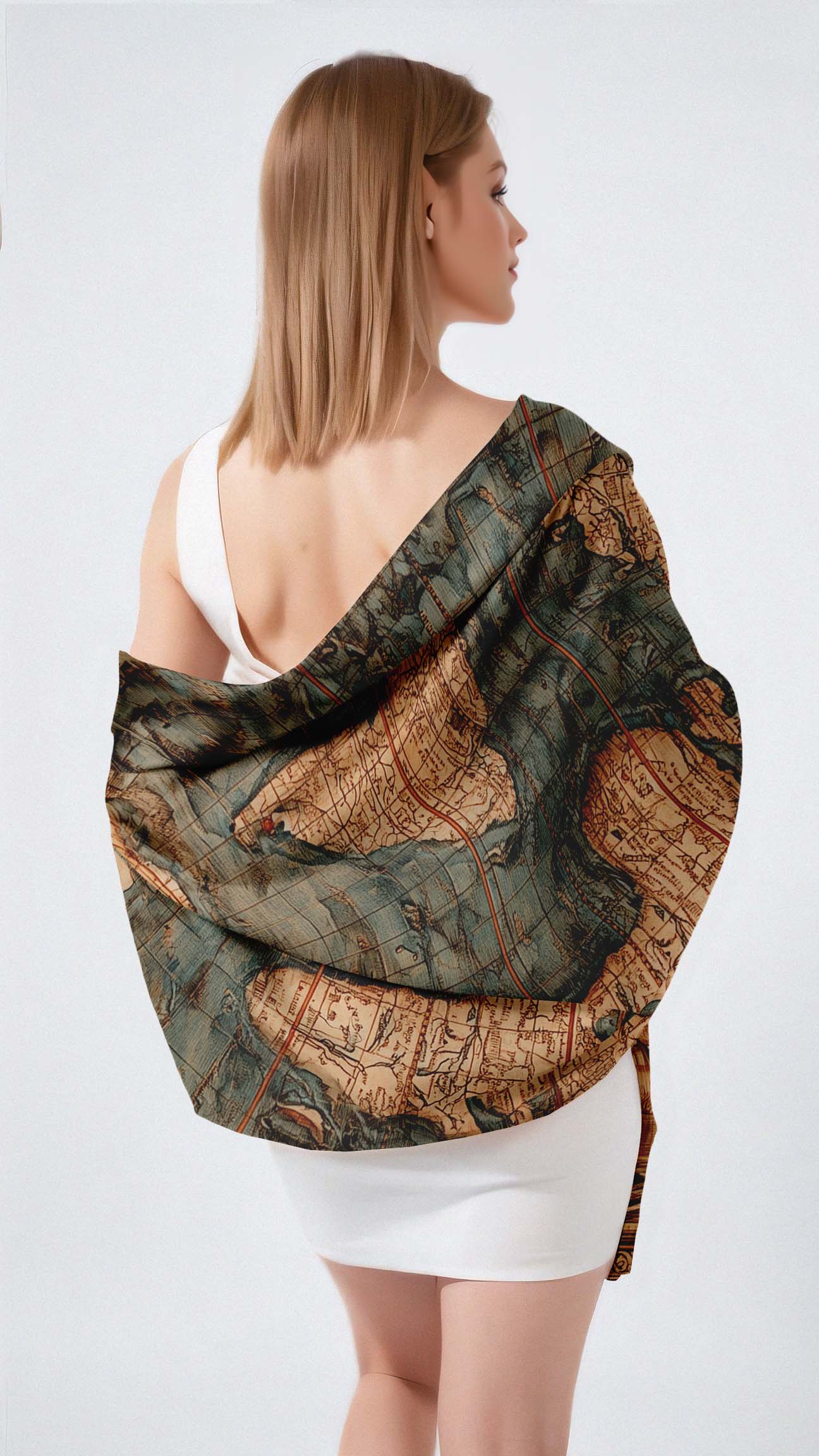 A vintage-style world map surrounded by intricate biblical and historical illustrations, depicting scenes of exploration, civilization, and scripture. The artwork reflects a fusion of cartographic detail with ornate storytelling through sepia-toned etching.