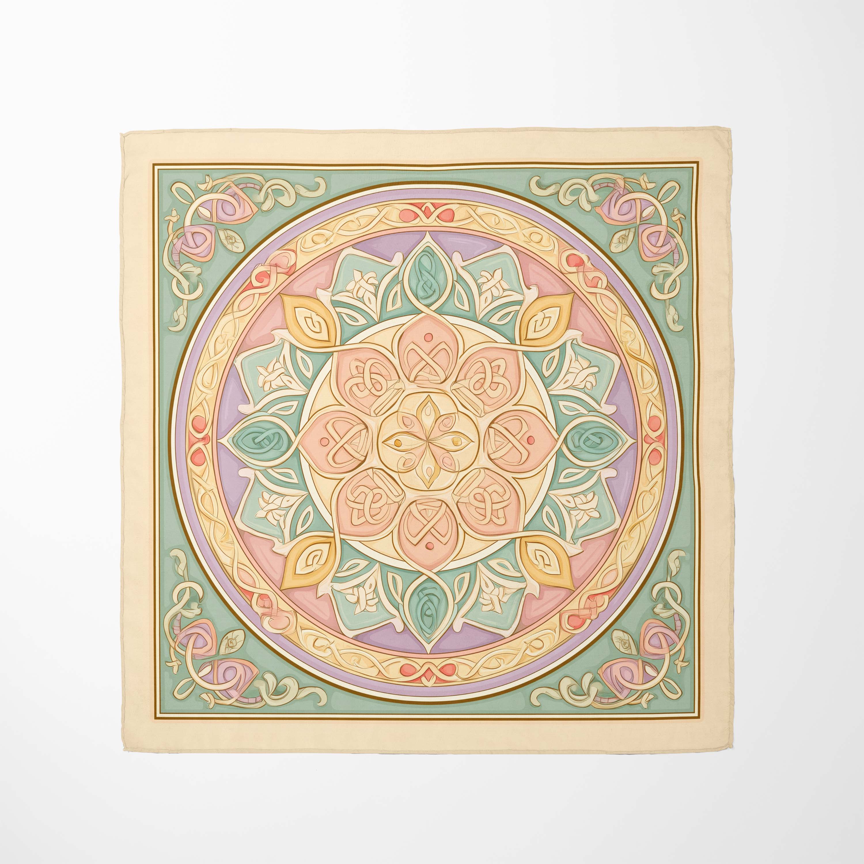 A soothing mandala infused with pastel tones and delicate ethnic patterns, radiating balance and unity. The soft beige base enhances the intricate symmetry and tranquil aura of this ornamental artwork.