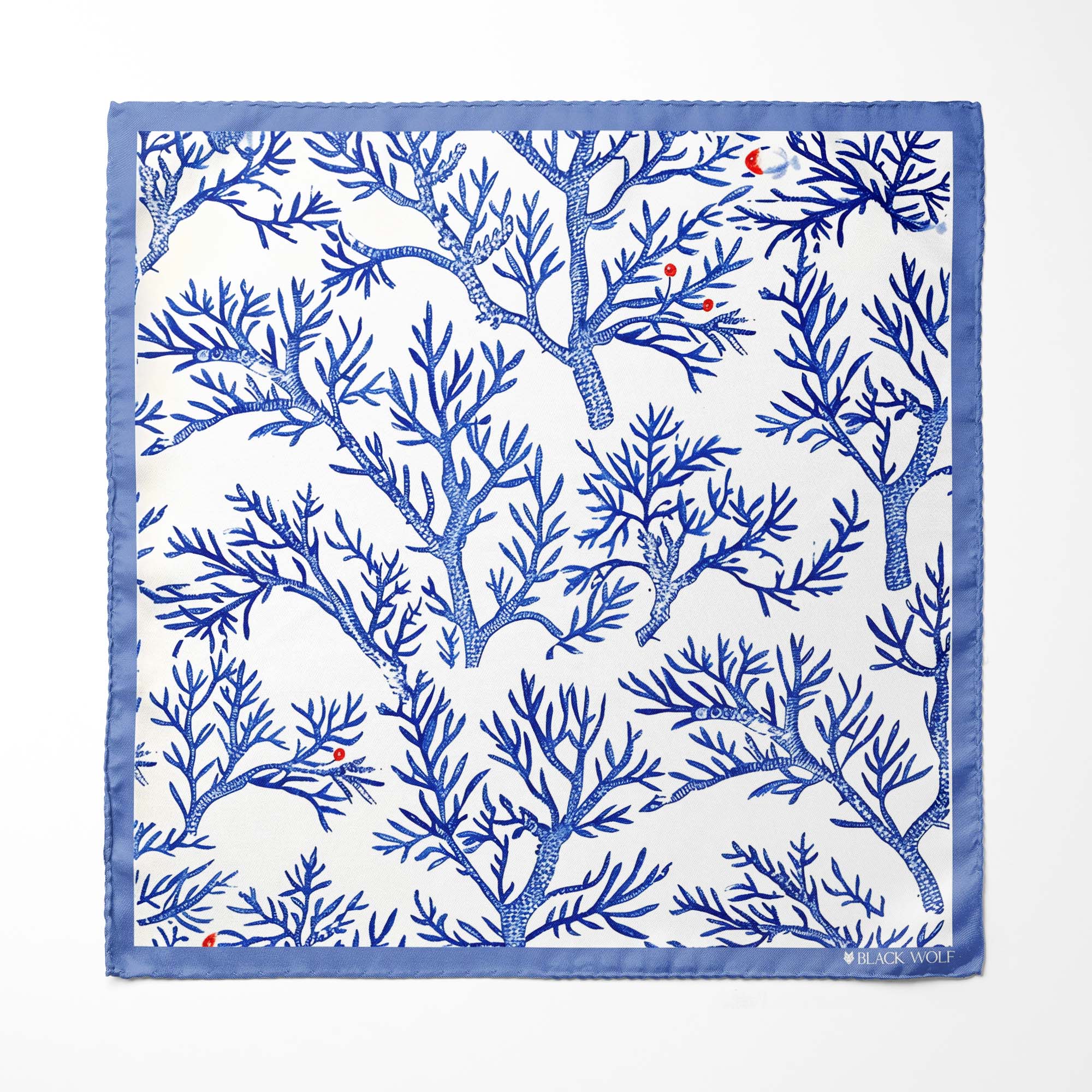 Sophisticated white pocket square with intricate blue coral branches and subtle red accents, exuding elegance and versatility, ideal for refined outfits.