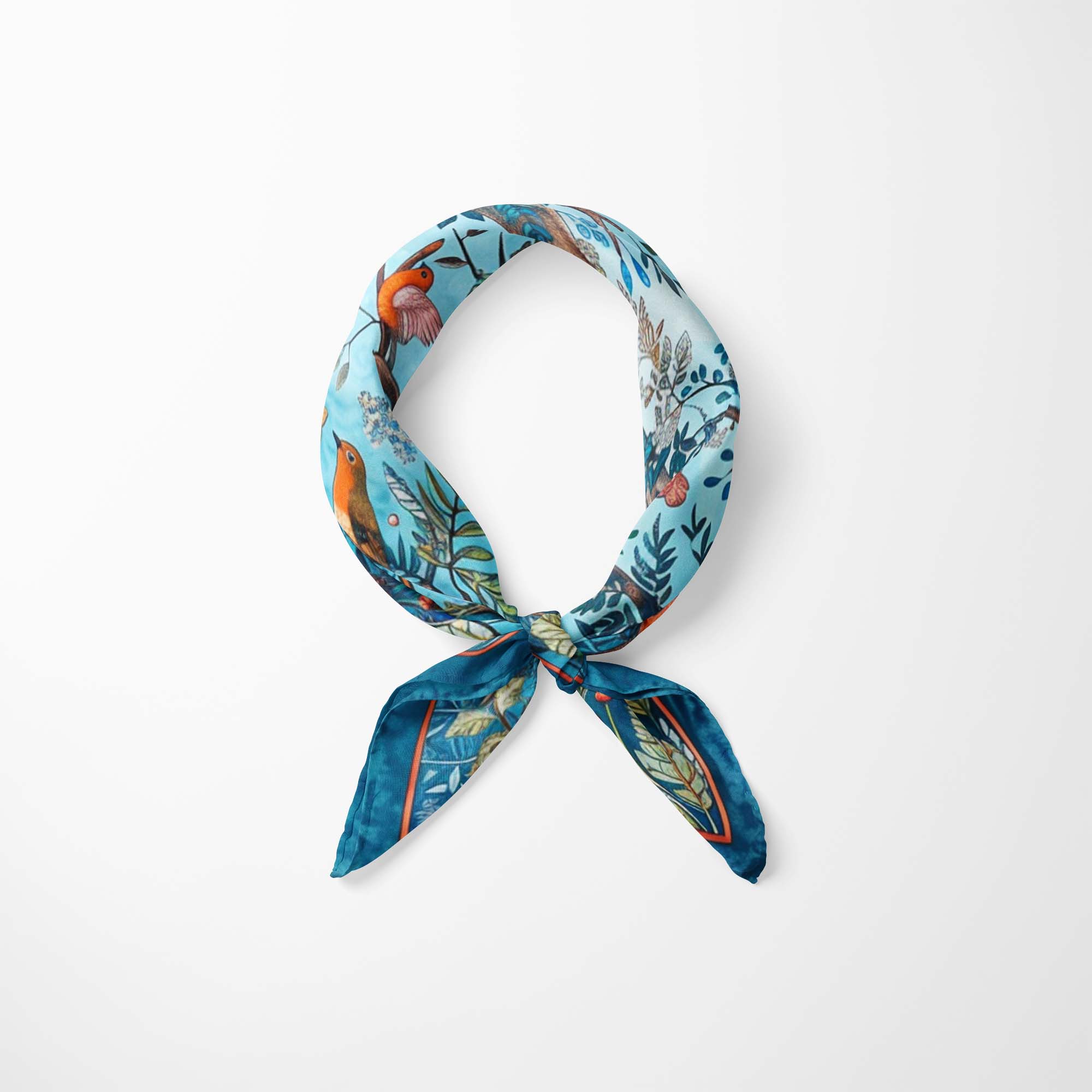 This vibrant design features a lively forest scene with colorful birds perched among flowering trees and foliage. The turquoise background enhances the richness of nature's palette and brings a sense of harmony and freshness.