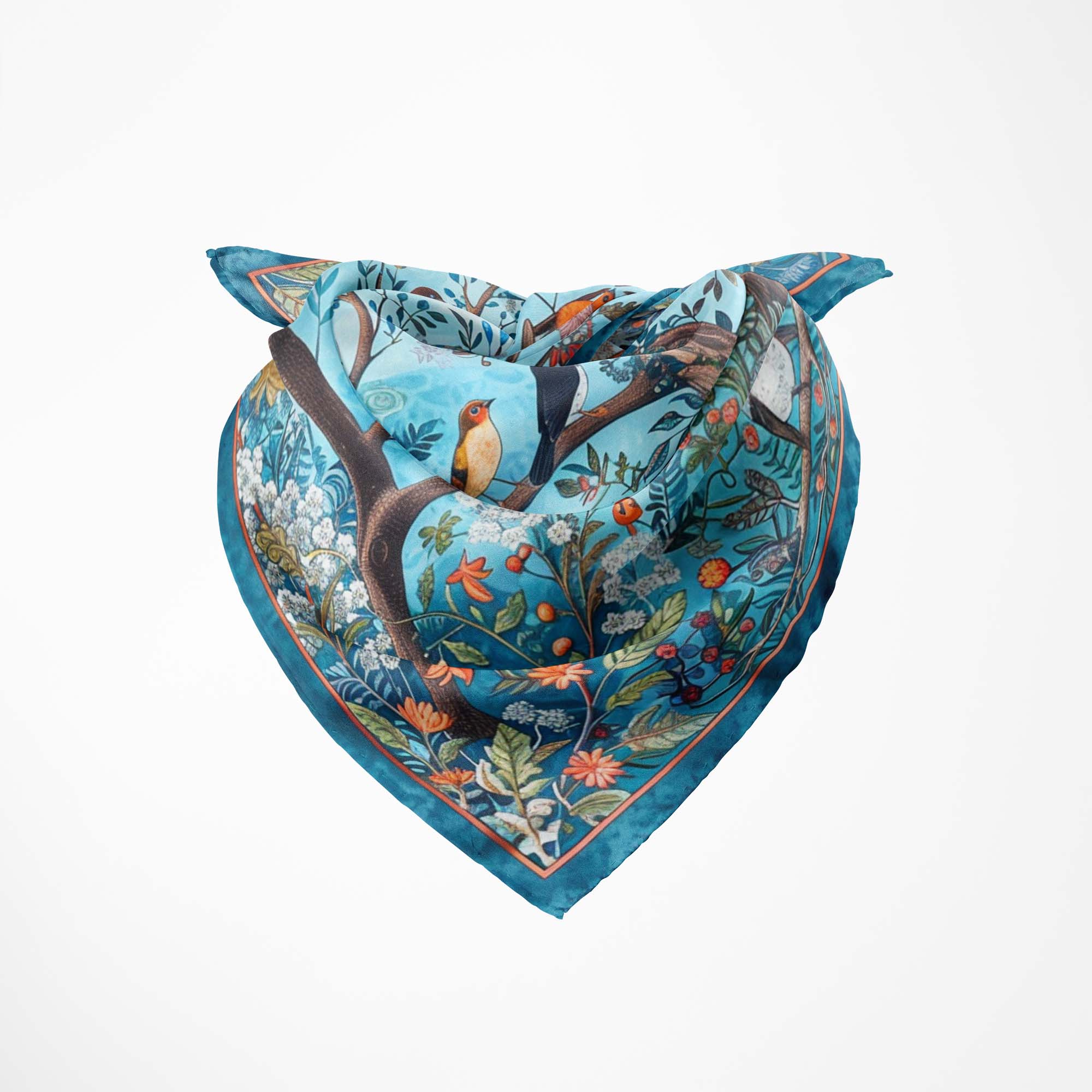 This vibrant design features a lively forest scene with colorful birds perched among flowering trees and foliage. The turquoise background enhances the richness of nature's palette and brings a sense of harmony and freshness.