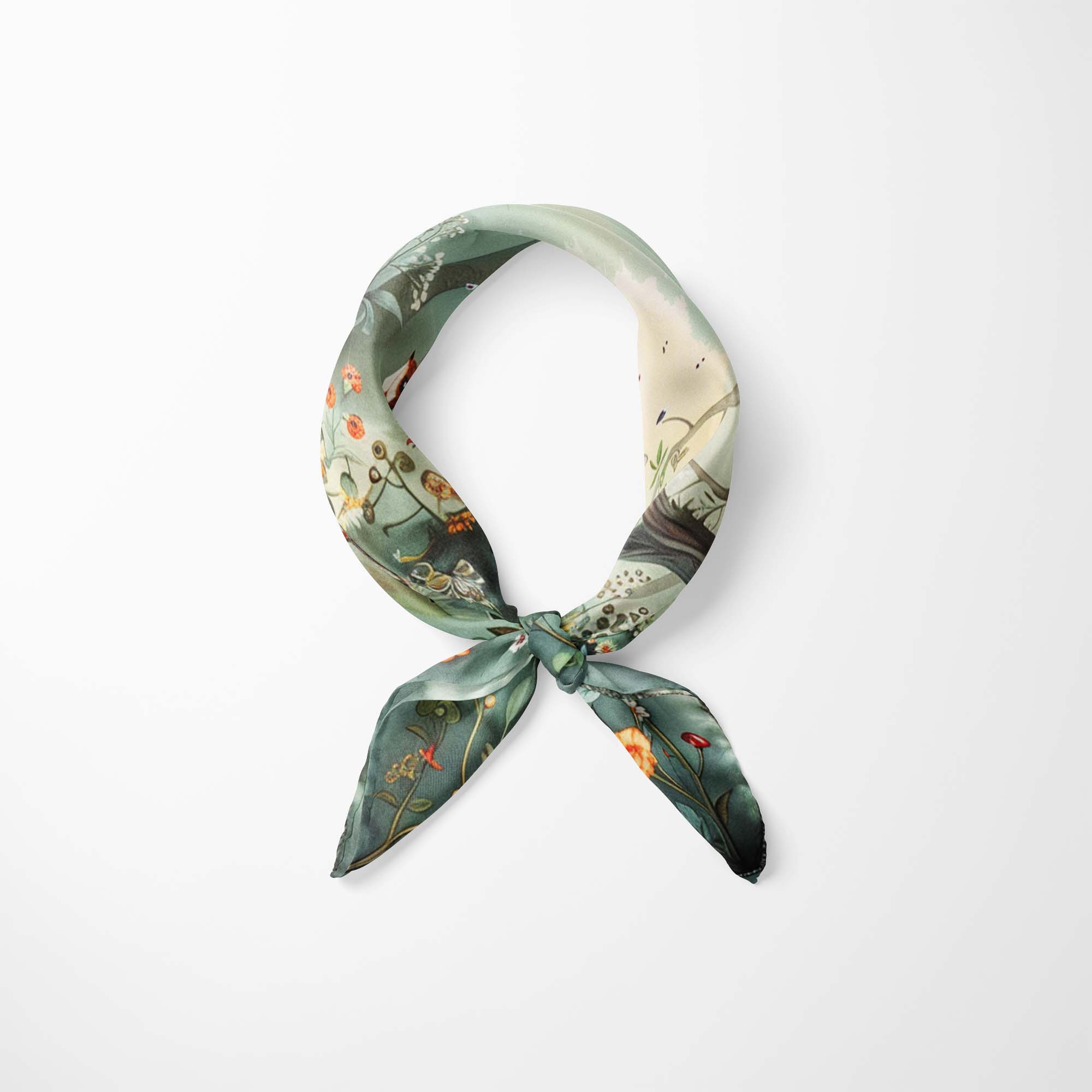 A whimsical forest scene where songbirds flutter among blooming wildflowers and arching trees under a soft minty sky. The design captures the serene magic of nature in a storybook-like illustration.