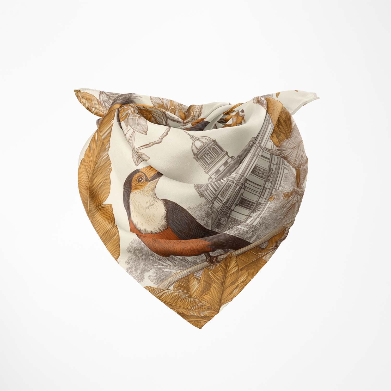 A vintage-style illustration showcasing exotic birds, sloths, and tropical foliage with a neoclassical architectural backdrop in earthy sepia and ochre tones.