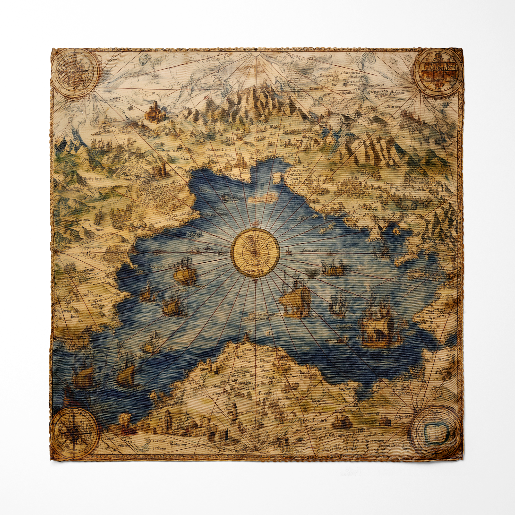 An intricate antique-style map featuring detailed coastlines, mountain ranges, and majestic ships sailing across a radiant sea. The central compass rose radiates directional lines, evoking a sense of adventure and discovery.