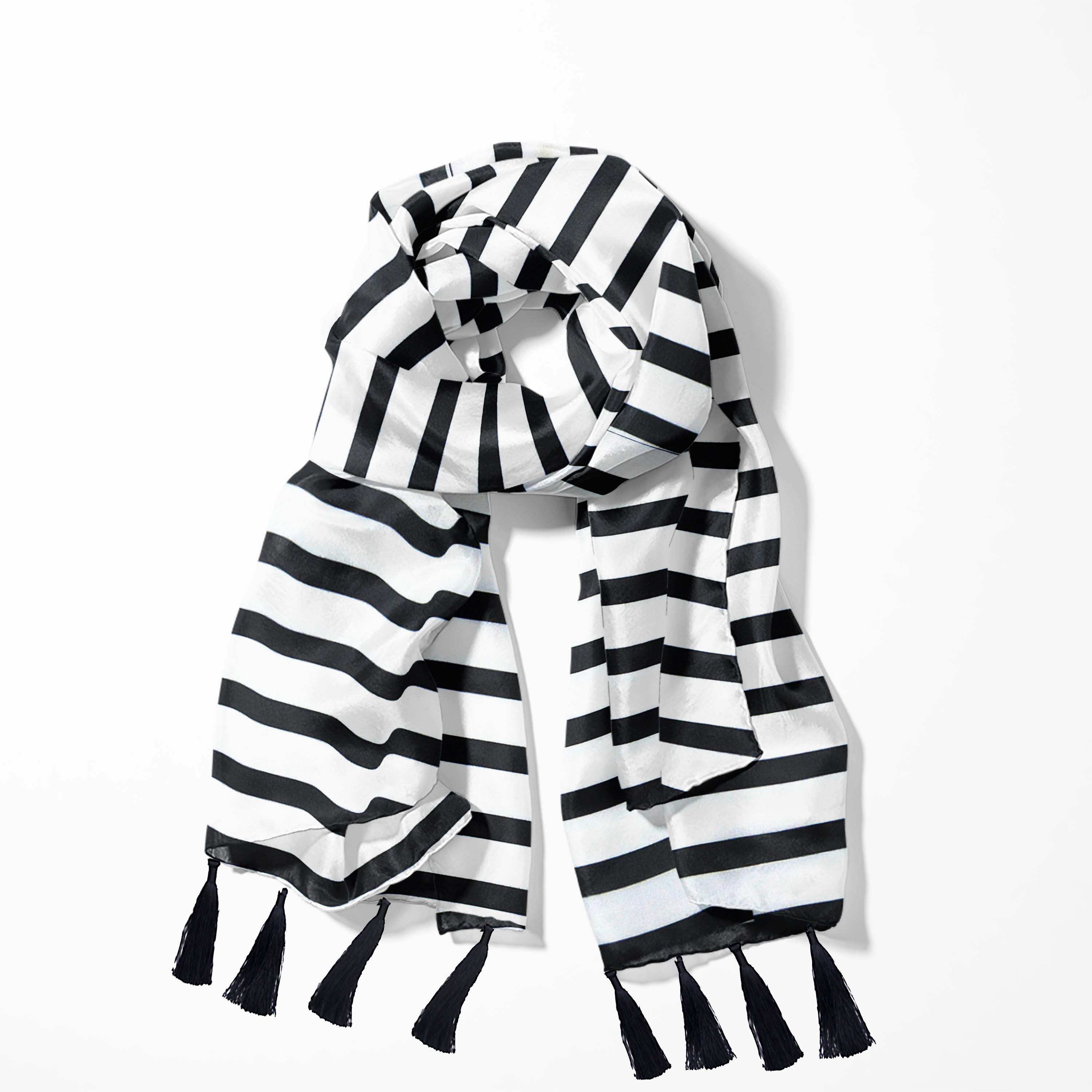 Delve into sophistication with our silk scarves adorned with white stripes. Elevate your style effortlessly with the captivating pattern, lightweight fabric, and versatile design, ensuring it's perfect for any occasion.
