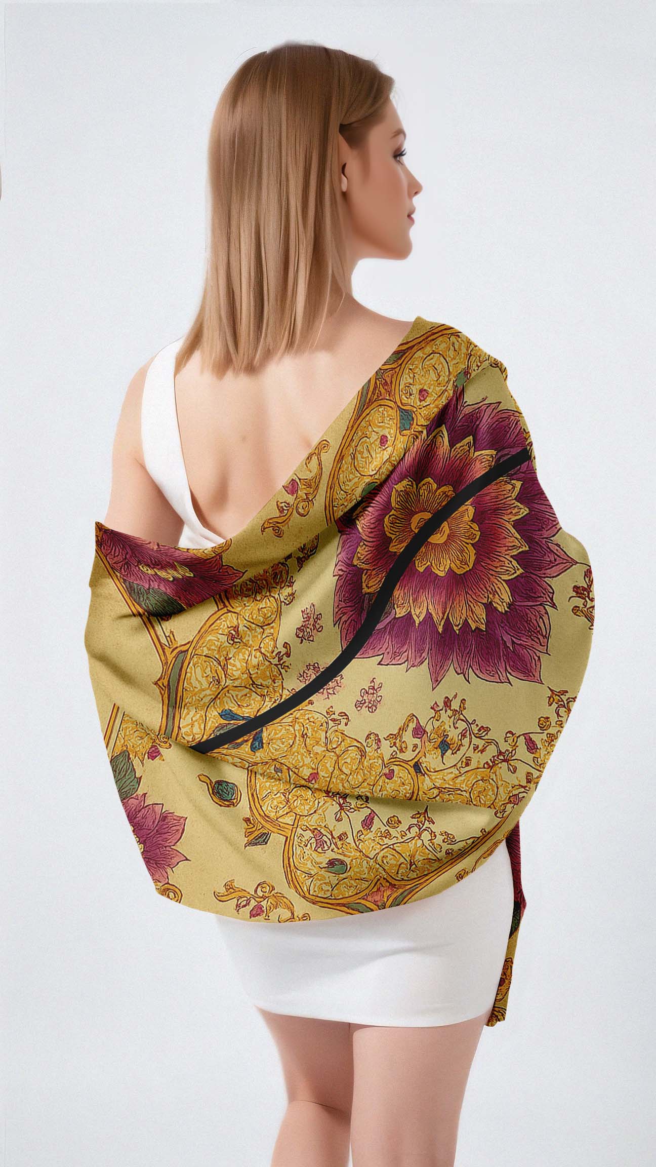 An ornate Mughal-style medallion blooms from the center with layers of intricate florals and golden filigree. Rich purples and warm yellows add regal elegance against a softly textured beige backdrop.